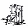 Силовая станция со скамьей на базе Машины Смита DFC 8500 - премиальное исполнение популярного силового тренажера Weider 8500. Комплект состоит из Машины Смита DFC D3022SM и скамьи с опциями DFC D3023B. Тренажер предназначен для выполнения различных силовых упражнений: Машина Смита, тяга сверху / снизу, баттерфляй, парта для бицепса, сгибание / разгибание, жим лежа на скамье дополнительной штанги (штанга и диски опция). Отдельно стоящая скамья с партой для бицепса и рычагом для тренировки ног (сгибание  / разгибание). Спинка скамьи позволяет отрегулировать угол наклона. Изготовлена из прочного стального профиля. В комплекте: гриф, 2 рукоятки для тяги, ремень на лодыжку, гибкая тяга для трицепса, замки-пружины для фиксации дисков. В качестве нагрузки используются диски Ø51 мм (опция, приобретаются отдельно). Кронштейны для установки штанги и предохранители регулируются по высоте. Для хранения весов (дисков) предусмотрены 4 держателя, посадочный размер 51 мм.
