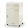 Тумбочка прикроватная на колёсах BLZ 016 с дополнительным выдвижным столиком и скруглённым белым фасадом. Передвижная прикроватная тумбочка на самоориентирующихся двойных роликах, два из которых которых оснащены тормозным устройством. Cнабжена отделением с дверцей и полкой внутри, глубоким выдвижным ящиком и дополнительным выдвижным столиком, убирающимся под топ. Столешница с четырехсторонней выпрессованной отбортовкой. Широкая металлическая ручка сбоку позволяет легко перемещать тумбочку или удобно подвешивать за неё различные аксессуары.